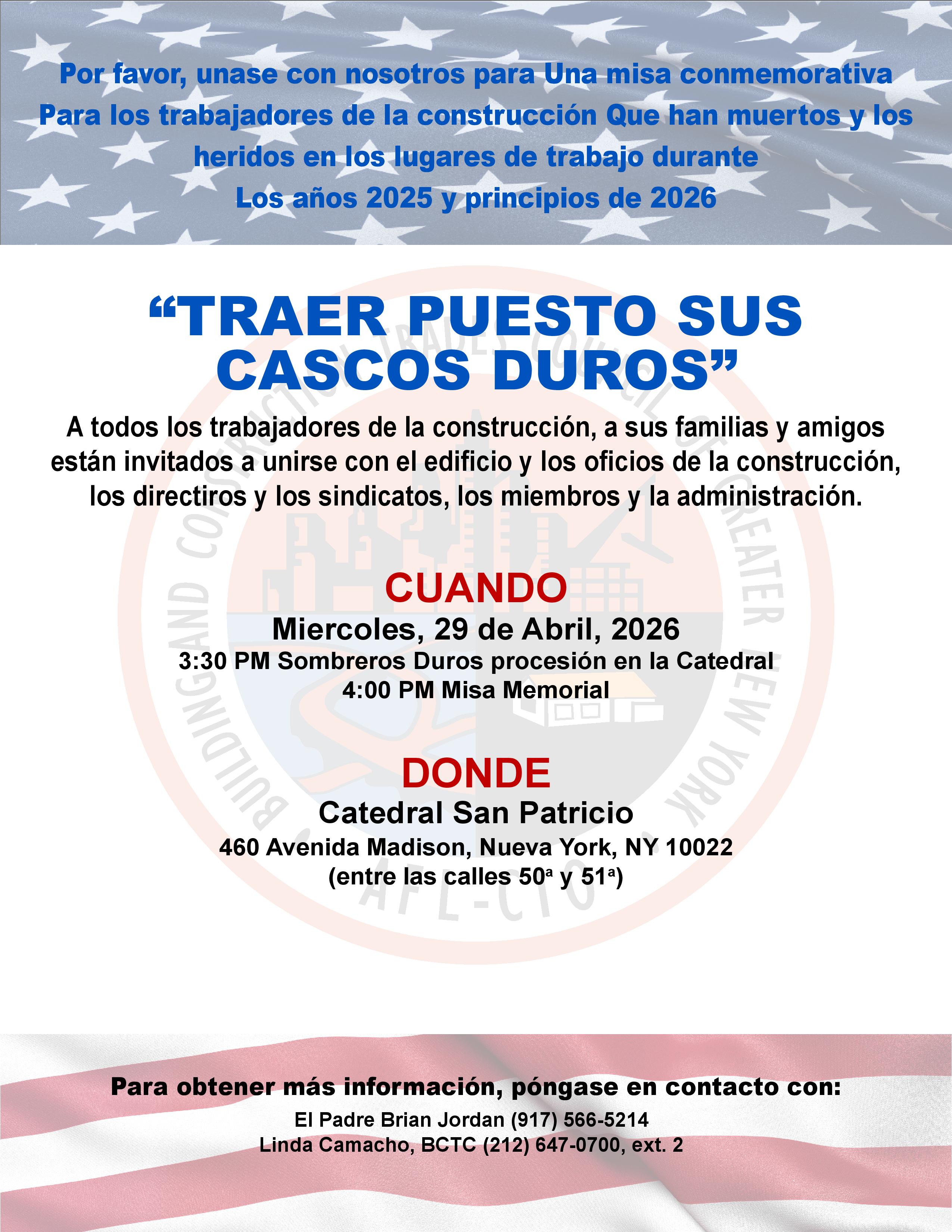 The hardhat procession into St. Patrick's Cathedral (5th Avenue between 50th and 51st Streets, New York, NY 10022) will start at 3:30 p.m., and the Memorial Mass will start at 4:00 p.m.