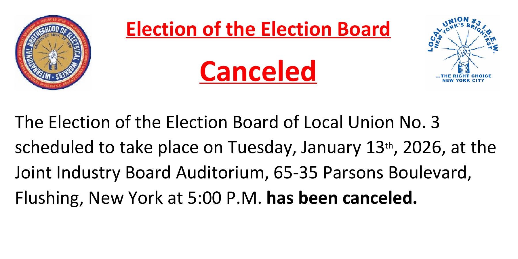 The number of nominees to serve on the Election Board equals the number of open seats, therefore, the Secret Ballot Election of the Election Board scheduled to take place on Tuesday, January 13th, has been canceled.