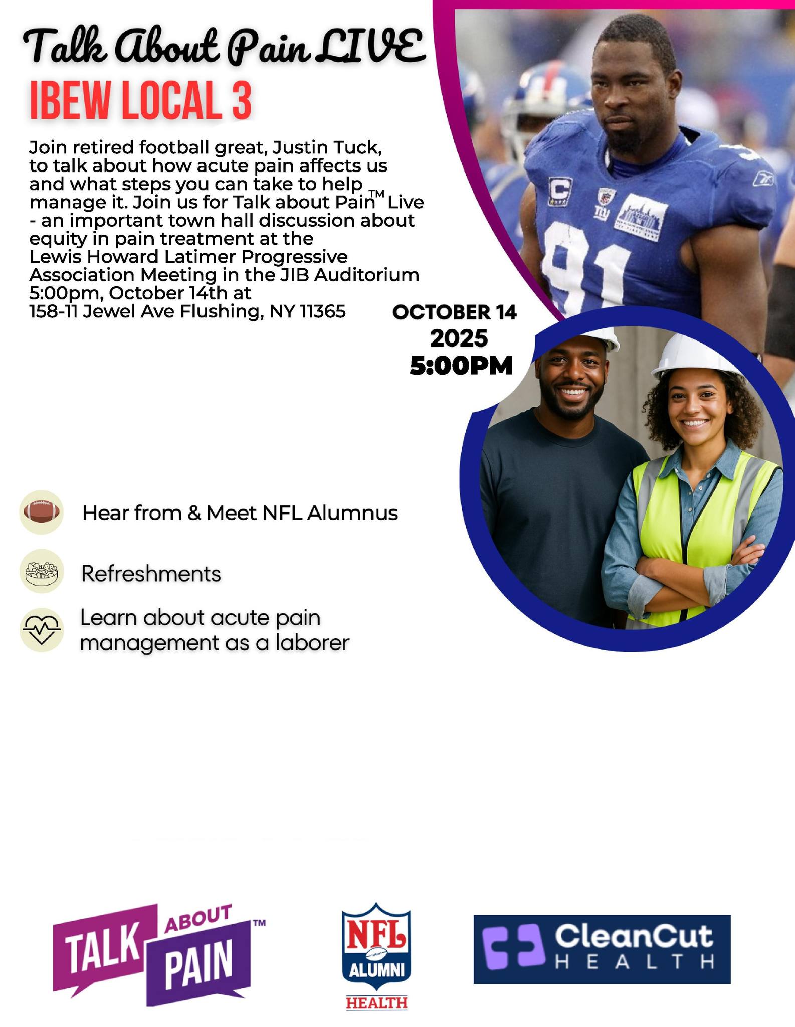 This Tuesday, October 14th, in the Electric Industry Center Auditorium, Local 3 IBEW and the Lewis Howard Latimer Progressive Association invite you to a town hall with Talk About Pain™ spokesman and two-time Super Bowl champion Justin Tuck, who will lead a discussion about acute pain, treatment options, and equity in healthcare. The program starts at 5:00 p.m. and refreshments will be served.