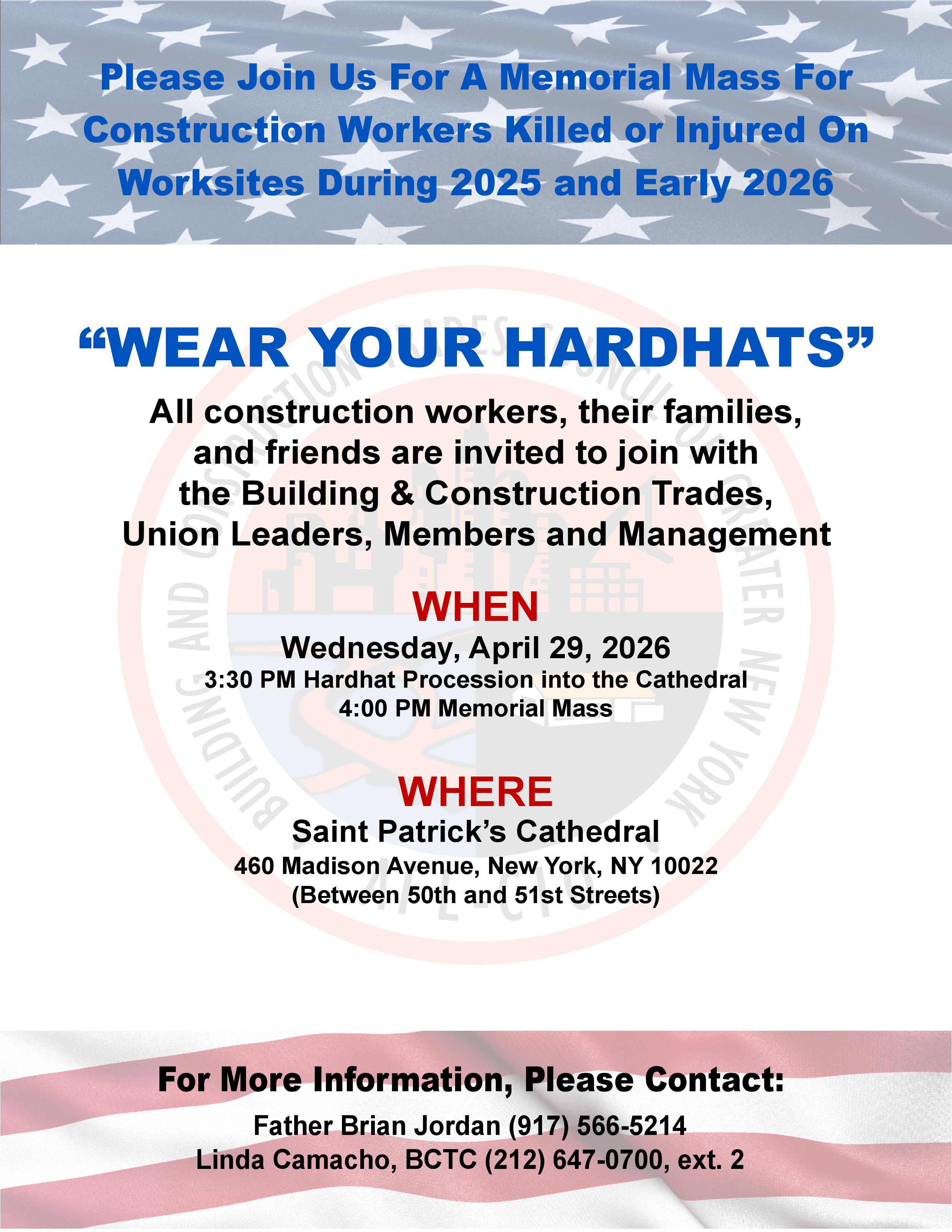 The hardhat procession into St. Patrick's Cathedral (5th Avenue between 50th and 51st Streets, New York, NY 10022) will start at 3:30 p.m., and the Memorial Mass will start at 4:00 p.m.